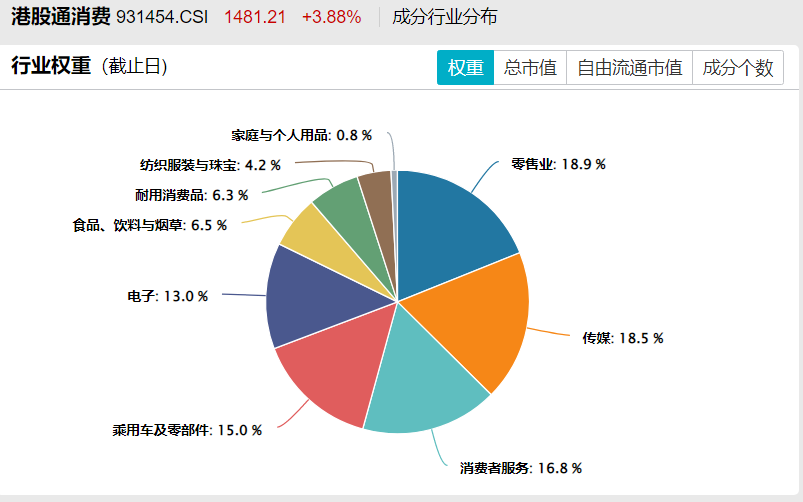 中证港股通消费主题指数:根据中证二级行业划分,该指数行业分布极为广泛,涵盖了零售业、传媒、消费者服务、乘用车及零部件、电子等多个领域。