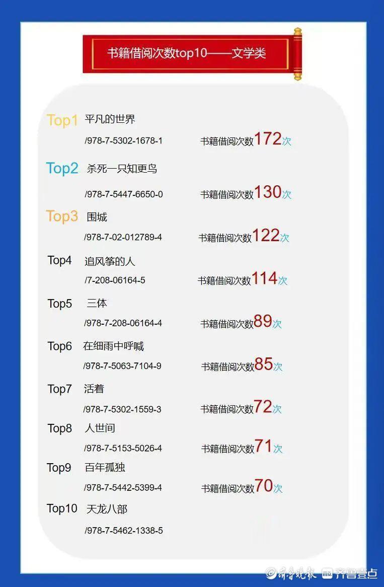 山东师范大最新公布的图书借阅量排行榜中,文学类书籍借阅次数最高的是《平凡的世界》,其次是《杀死一只知更鸟》,排在第三位的是《围城》。非文学类借阅次数最高的是《毛泽东选集》。
