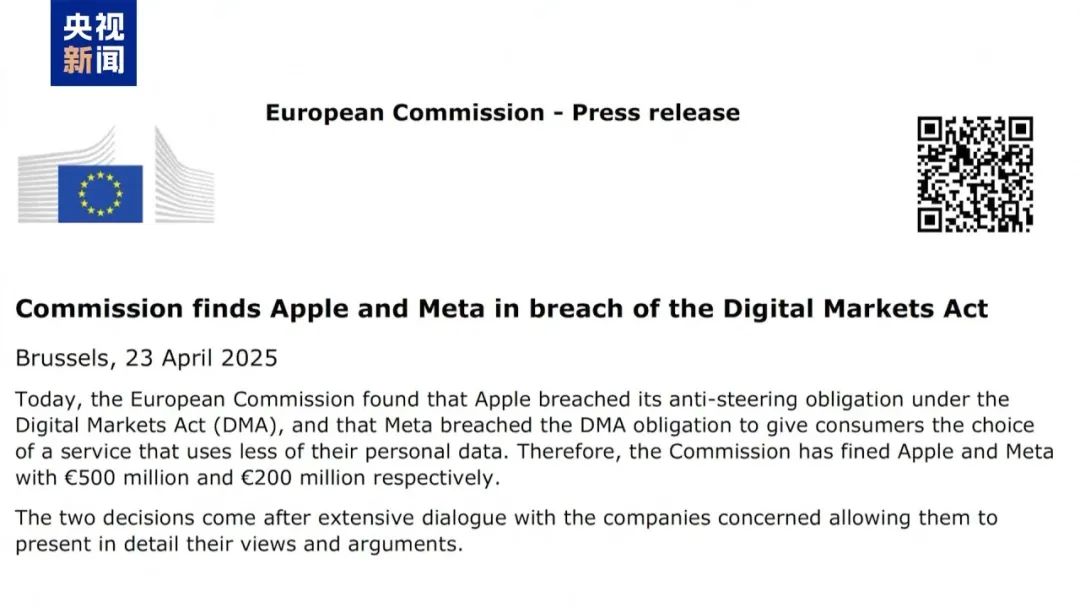 欧盟委员会23日认定美国苹果公司和元宇宙平台公司(Meta)违反《数字市场法案》,对两家公司分别处以5亿欧元和2亿欧元罚款。舆论普遍认为,此举可能加剧当前欧盟与美国之间的贸易紧张局势。