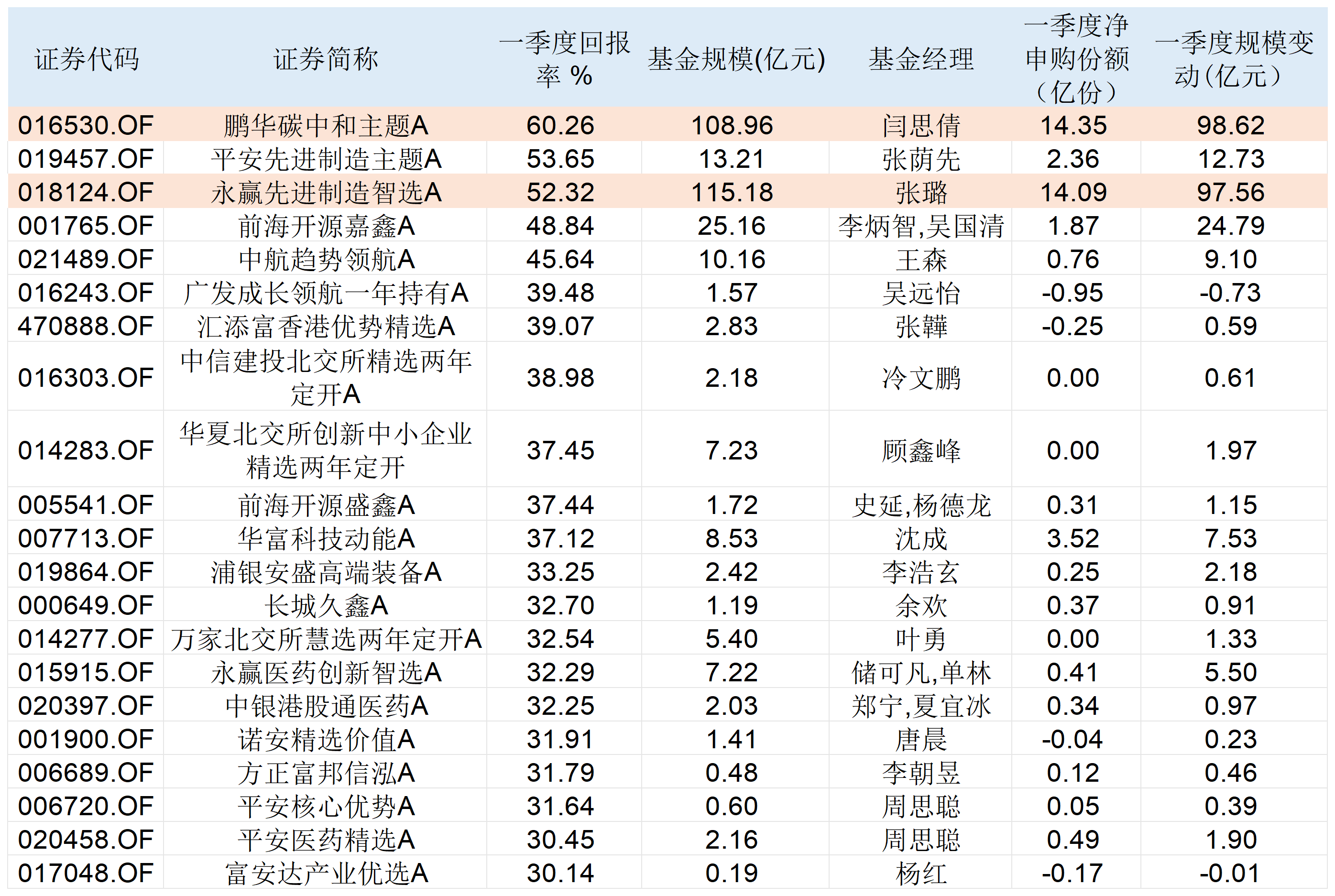 鹏华碳中和主题、永赢先进制造智选凭借单季度60.26%、52.32%的出色业绩疯狂吸金,两只基金季末规模均突破100亿元。此外,平安先进制造主题A一季度的规模增幅超过26倍,从0.48亿元的迷你基摇身一变迈进10亿元级别,季末规模达到13.21亿元。