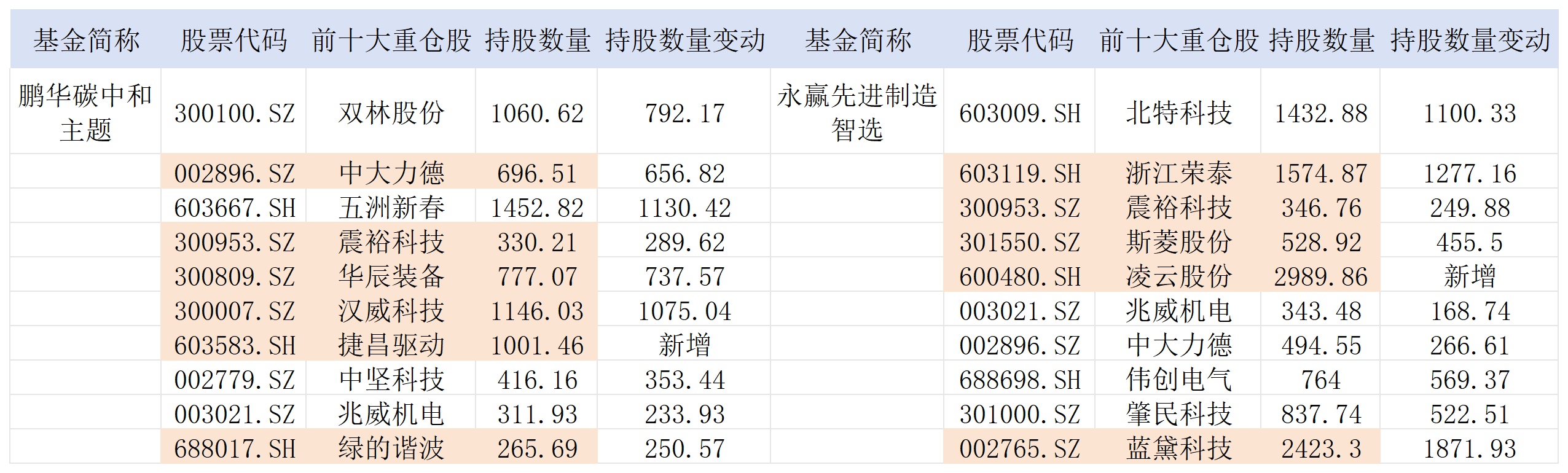 从持仓来看,一季度鹏华碳中和、永赢先进制造智选均进行了大手笔的调仓,前十大重仓股中新成员的数量分别为6只、5只。对比发现,两只基金共同重仓的个股有中大力德(002896.SZ)、震裕科技(300953.SZ)、兆威机电(003021.SZ)三只。