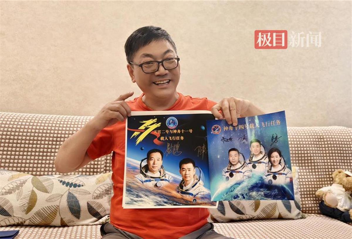 姚志强向记者展示他与陈冬的合影,回忆陈冬给他讲述太空生活,两人还一起畅聊祖国航天事业的发展,以及各自对航天的理解与展望。姚志强还向记者展示陈冬送给他的神十一和神十四发射的纪念邮册,以及他收藏的有关陈冬飞天报道的报纸。