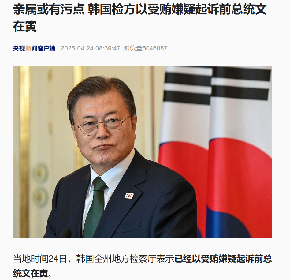 当地时间4月24日,韩国全州地方检察厅表示已经以受贿嫌疑起诉前总统文在寅。