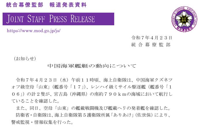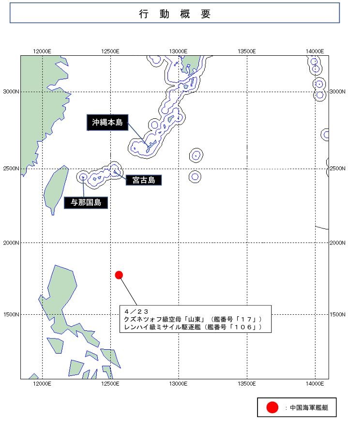 据日本防卫省统合幕僚监部(简称统幕)本月23日发布的一则“中国海军舰艇动向”通报,通报中称,当天上午11时许(北京时间上午10时许),海上自卫队当天于宫古岛以南约790千米处的海域,即菲律宾吕宋岛以东的太平洋面上,确认到了由山东号航母以及1艘055型导弹驱逐舰(106延安舰)组成的舰艇编队正在航行。