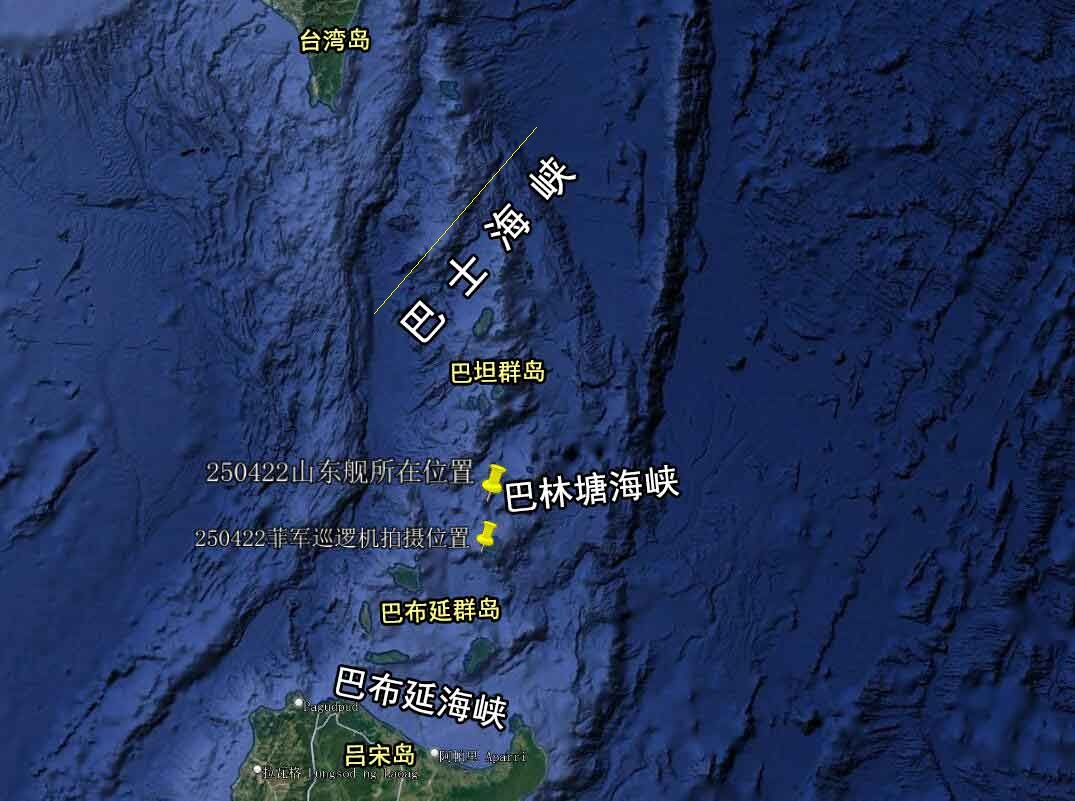 另据菲律宾《每日论坛报》(DailyTribune)在社交媒体上的推文显示,菲律宾军方声称,4月22日“在巴布延岛西南约2.23海里处”的一架飞机,拍摄到了正在航行的中国海军山东号航母,同日还发现了一艘舷号为797的815A型电子侦察船,菲方拍摄到的是此次进入太平洋的山东舰正在向东穿越当中的巴林塘海峡或巴布延海峡。