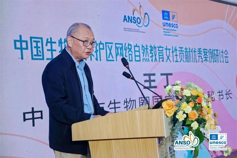 中国MAB秘书长王丁在致辞中指出,女性是我国自然教育工作的主力军。本次评审围绕主题性、代表性、创新性、影响力、本土性、区域性等6个标准,最终推选出的66项女性优秀案例,集中展现了不同区域、不同群体的女性从业者对践行“人与生物圈计划”理念的自然教育事业做出的贡献,对推动传播人与自然和谐共生的中国方案具有重要意义。同时,王丁秘书长提出了三点期待和建议,一是以本次研讨会为“孵化器”,通过案例剖析、经验萃取,形成可复制、可推广的自然教育范式和政策建议;二是以第五届世界生物圈保护区大会自然教育边会为“扩音器”,向世界展示中国,特别是中国女性在自然教育领域的优秀实践与经验;三是以ANSO与中国MAB的合作为“推进器”,构建双方自然教育合作的长效机制,让基于自然的生态文明教育的中国智慧惠及全球。
