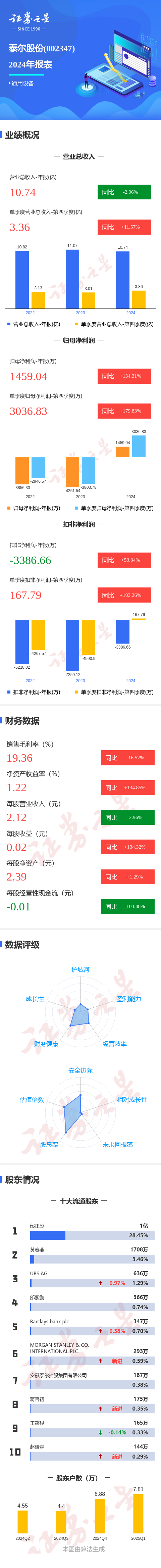 证券之星消息,泰尔股份2024年年报显示,公司主营收入10.74亿元,同比下降2.97%;归母净利润1459.05万元,同比上升134.32%;扣非净利润-3386.66万元,同比上升53.35%;其中2024年第四季度,公司单季度主营收入3.37亿元,同比上升11.57%;单季度归母净利润3036.83万元,同比上升179.84%;单季度扣非净利润167.79万元,同比上升103.36%;负债率51.63%,投资收益3509.8万元,财务费用102.33万元,毛利率19.36%。