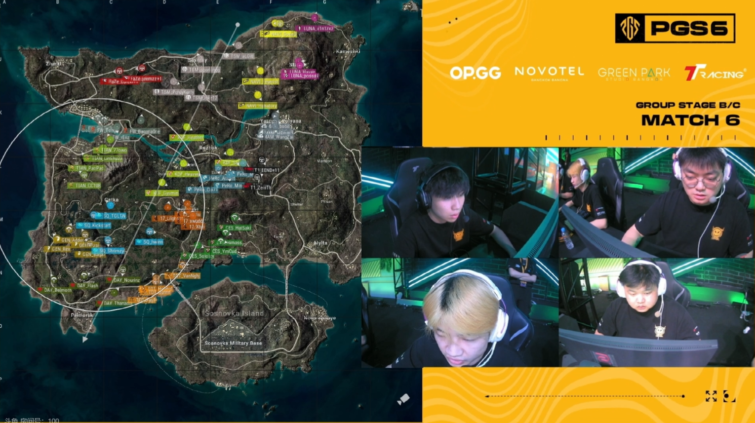 最后这把下班局给了个西部圈,NAVI憋不住了直接要冲天霸的假车库,双方支援到位后TSM着急劝架也扎了进来,夹在中间的天霸被淘汰后TSM仅剩一人惨胜NAVI,另一侧空降的4AM遭到GEN火箭筒一炮三响瞬间团灭。阶段3蓝圈收缩,17扎进了PeRo的房区,XDD绕到侧面连打两人后无伤把17带走,六扇门的DAY吃到了一个天命圈,右侧的SQ发力淘汰了TDT,很可惜这波起势对他们来说来得太晚了。