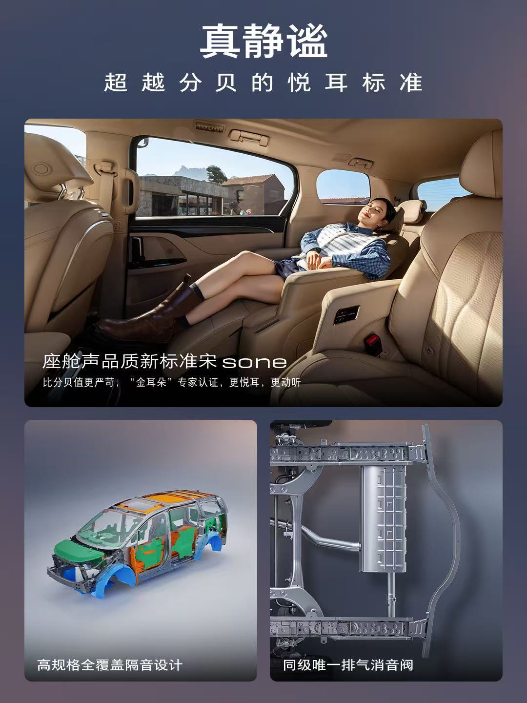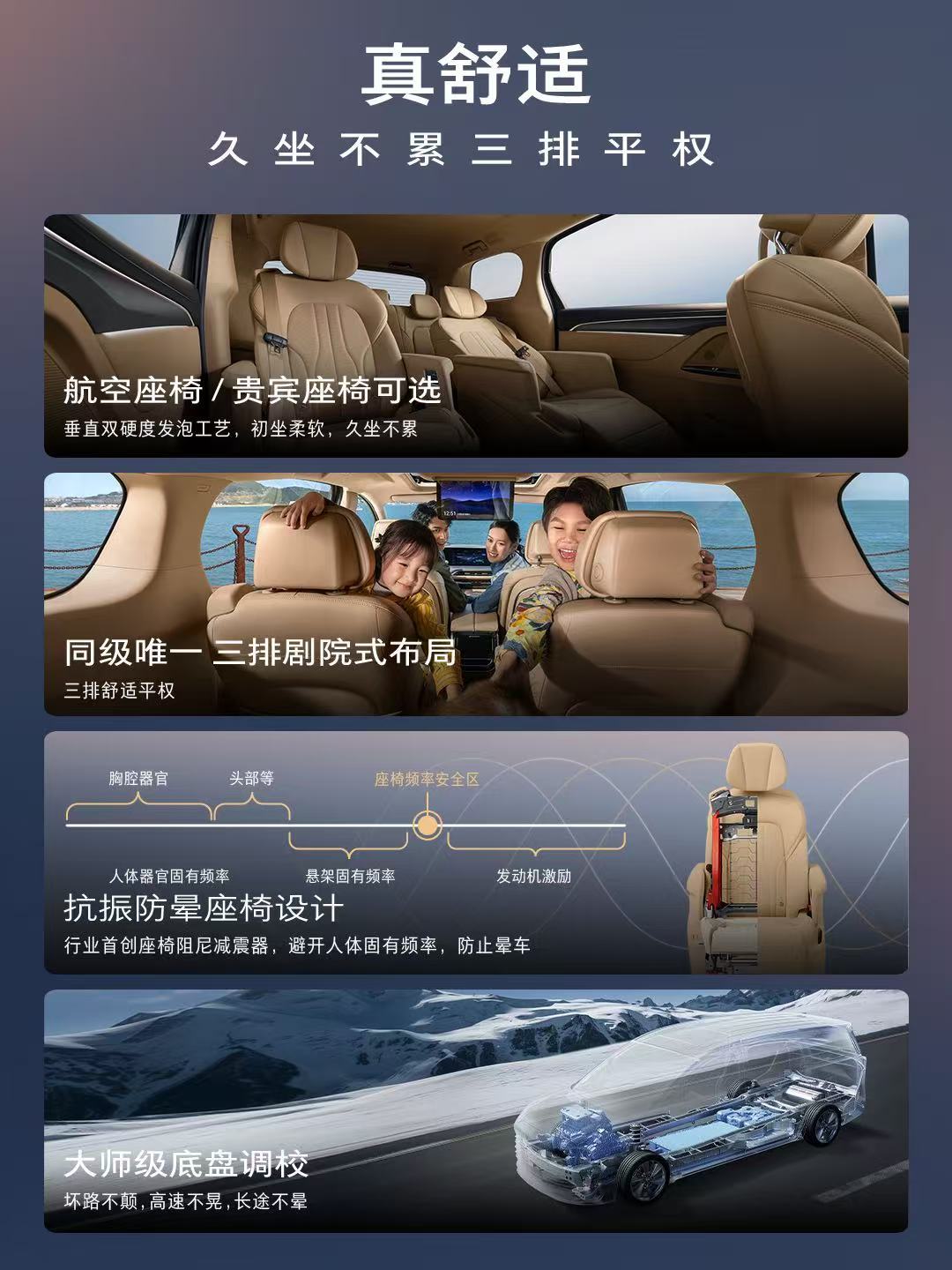 此外,新车还支持3.3kW外放电功能;第一、二排座椅均配备有座椅加热和通风功能,第二排的独立航空座椅还有专属头枕和电动腿托;还有小桌板、老板键和15.6英寸吸顶屏。