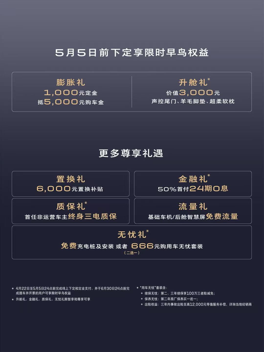 上市权益方面,即日起至5月5日完成线上下定和定金支付、并于6月30日完成提车并开票的用户可享限时早鸟权益,包括1000元定金抵5000元购车金以及价值3000元的升舱礼。
