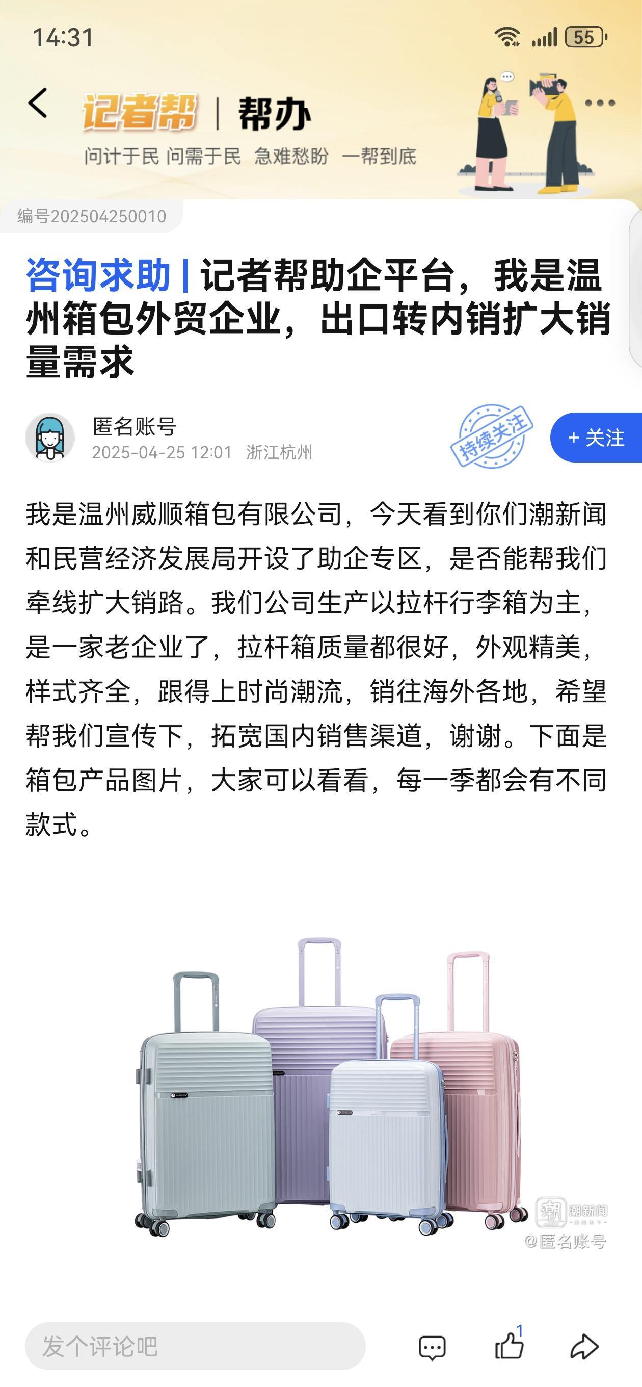 浏览到潮新闻“记者帮·浙江助企专区”,他抱着试试看的心情发了帖,他想让国内用户看看他们的箱包,“款式新、功能全,跟得上时尚潮流。”