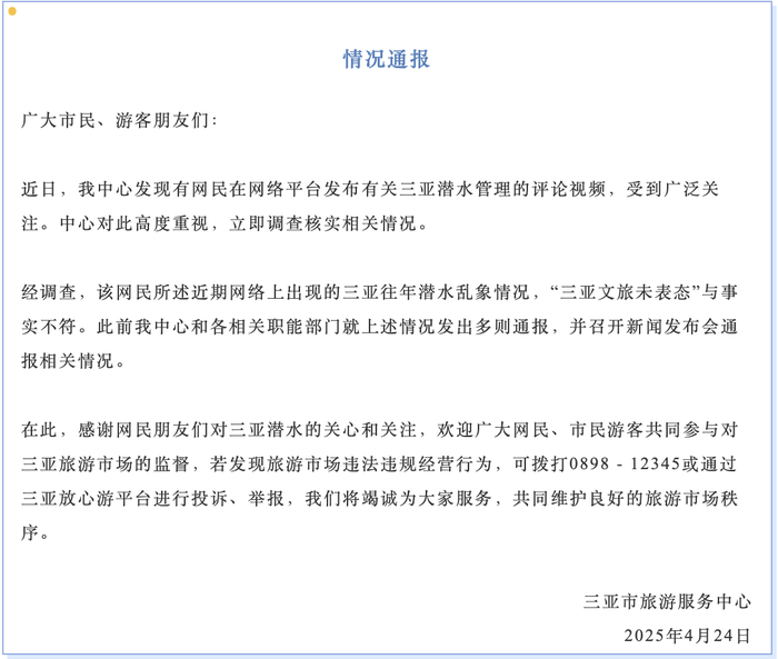 三亚市旅游服务中心通报,近日,三亚旅游服务中心发现有网民在网络平台发布有关三亚潜水管理的评论视频,受到广泛关注。经调查,该网民所述近期网络上出现的三亚往年潜水乱象情况,“三亚文旅未表态”与事实不符。若发现旅游市场违法违规经营行为,可进行投诉举报。