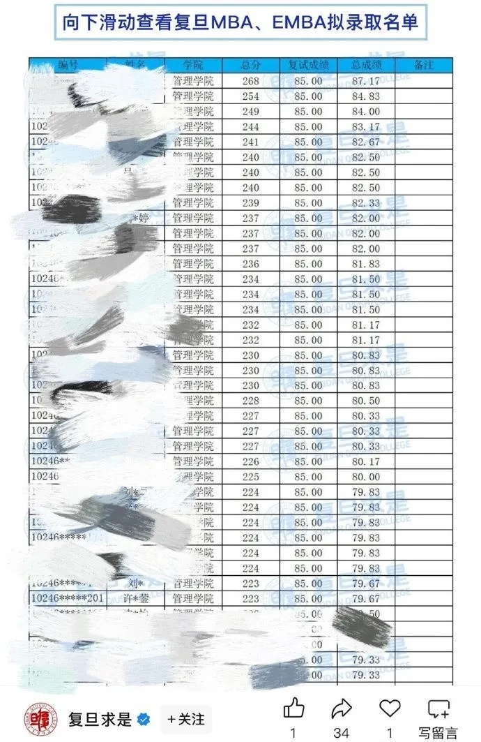 据封面新闻,4月25日,记者登录复旦大学研究生招生网,在2025年拟录取硕士研究生名单公示表格中,发现了一位名叫许某蓥的考生,笔试223分,面试85分,总成绩79.67分,复试院系为管理学院。