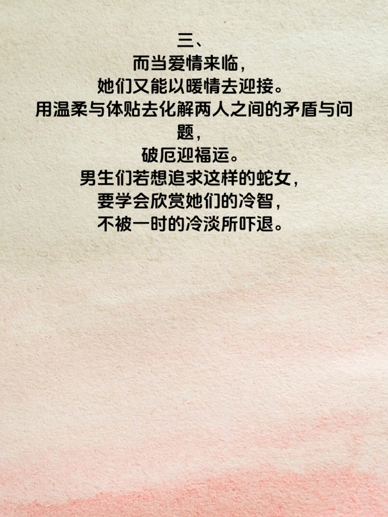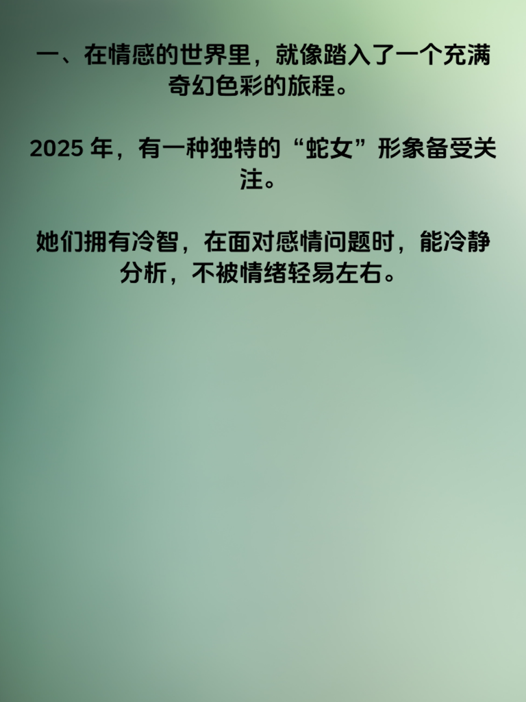一、在情感的世界里,就像踏入了一个充满奇幻色彩的旅程。2025 年,有一种独特的“蛇女”形象备受关注。她们拥有冷智,在面对感情问题时,能冷静分析,不被情绪轻易左右。 二、这种冷智让她们在感情中不会盲目冲动,能精准地看清局势。同时,她们也善于把握财机,懂得为自己的生活积累物质基础,这不仅让自己更独立,也能在感情中保持平等的姿态。 三、而当爱情来临,她们又能以暖情去迎接。用温柔与体贴去化解两人之间的矛盾与问题,破厄迎福运。男生们若想追求这样的蛇女,要学会欣赏她们的冷智,不被一时的冷淡所吓退。 四、在相处中,给予她们足够的尊重和空间,让她们能自由发挥自己的智慧。当遇到困难时,展现出你的担当,与她们携手共同破厄。用真诚的暖情去打动她们,如此,便能一同迎来美好的福运,开启甜蜜的爱情篇章。