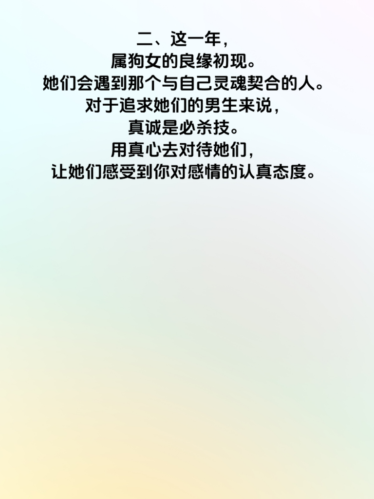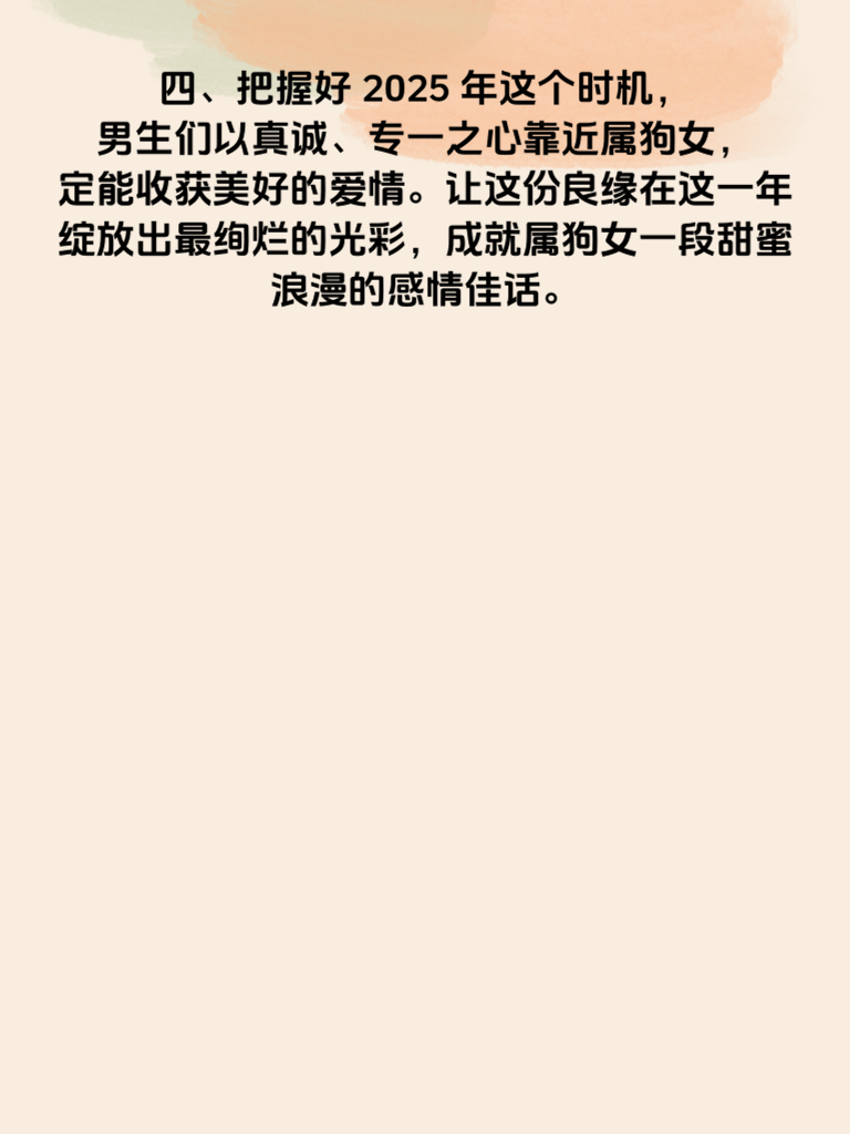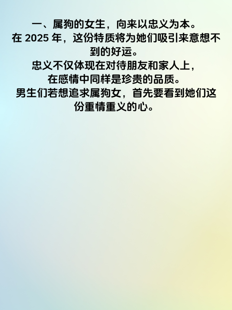 一、属狗的女生,向来以忠义为本。在 2025 年,这份特质将为她们吸引来意想不到的好运。忠义不仅体现在对待朋友和家人上,在感情中同样是珍贵的品质。男生们若想追求属狗女,首先要看到她们这份重情重义的心。 二、这一年,属狗女的良缘初现。她们会遇到那个与自己灵魂契合的人。对于追求她们的男生来说,真诚是必杀技。用真心去对待她们,让她们感受到你对感情的认真态度。 三、属狗女在 2025 年,凭借自身的忠义之气,会吸引来不少优秀的异性。但她们更渴望的是一份纯粹而坚定的爱情。男生们追求时,要展现出自己的专一和可靠,给她们足够的安全感。 四、把握好 2025 年这个时机,男生们以真诚、专一之心靠近属狗女,定能收获美好的爱情。让这份良缘在这一年绽放出最绚烂的光彩,成就属狗女一段甜蜜浪漫的感情佳话。