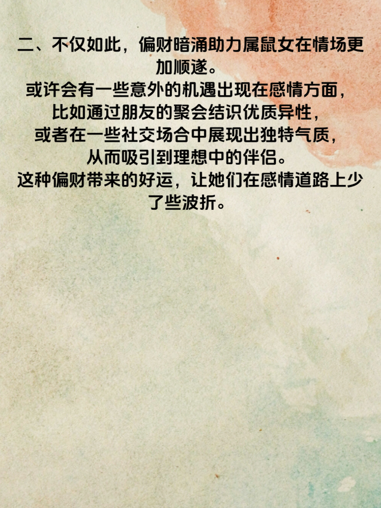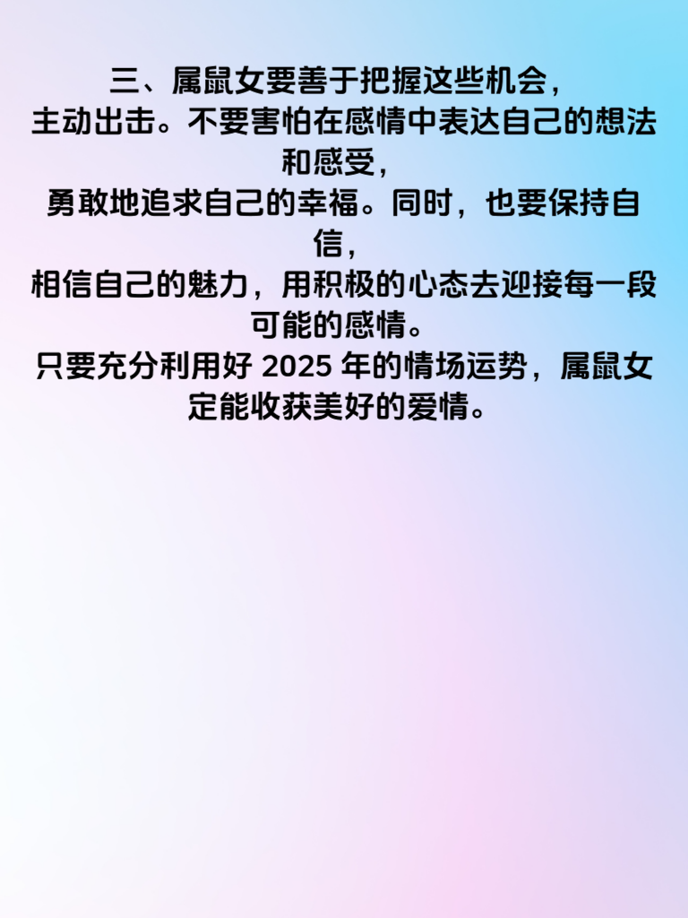 一、2025 年对于属鼠的女性来说,情场运势格外灵动。在这一年里,她们更容易展现出自身独特的魅力,吸引到心仪的对象。属鼠女心思细腻,善于洞察他人的心思,这在感情中是很大的优势。她们能够敏锐地捕捉到对方的情绪变化,给予恰到好处的关心和回应,让感情迅速升温。 二、不仅如此,偏财暗涌助力属鼠女在情场更加顺遂。或许会有一些意外的机遇出现在感情方面,比如通过朋友的聚会结识优质异性,或者在一些社交场合中展现出独特气质,从而吸引到理想中的伴侣。这种偏财带来的好运,让她们在感情道路上少了些波折。 三、属鼠女要善于把握这些机会,主动出击。不要害怕在感情中表达自己的想法和感受,勇敢地追求自己的幸福。同时,也要保持自信,相信自己的魅力,用积极的心态去迎接每一段可能的感情。只要充分利用好 2025 年的情场运势,属鼠女定能收获美好的爱情。
