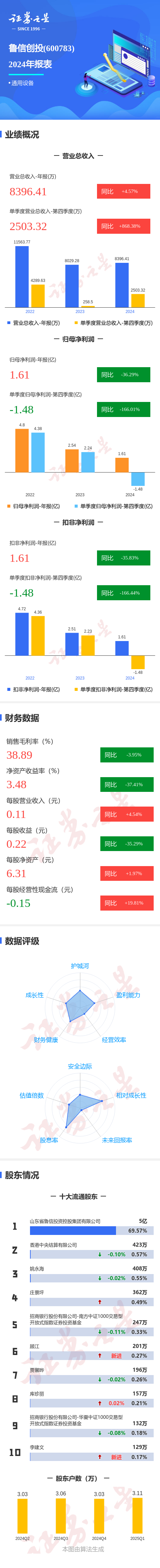 证券之星消息,鲁信创投2024年年报显示,公司主营收入8396.42万元,同比上升4.57%;归母净利润1.62亿元,同比下降36.29%;扣非净利润1.61亿元,同比下降35.83%;其中2024年第四季度,公司单季度主营收入2503.33万元,同比上升868.39%;单季度归母净利润-1.48亿元,同比下降166.01%;单季度扣非净利润-1.49亿元,同比下降166.45%;负债率47.14%,投资收益1.24亿元,财务费用1.33亿元,毛利率38.89%。