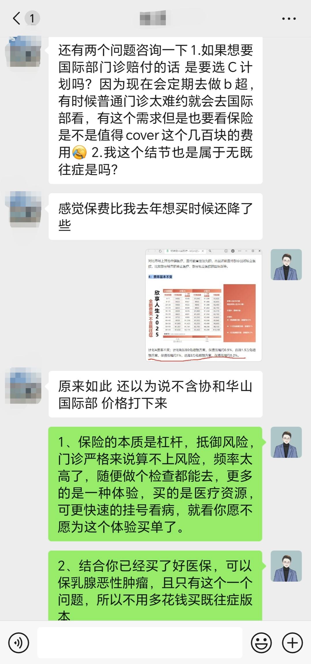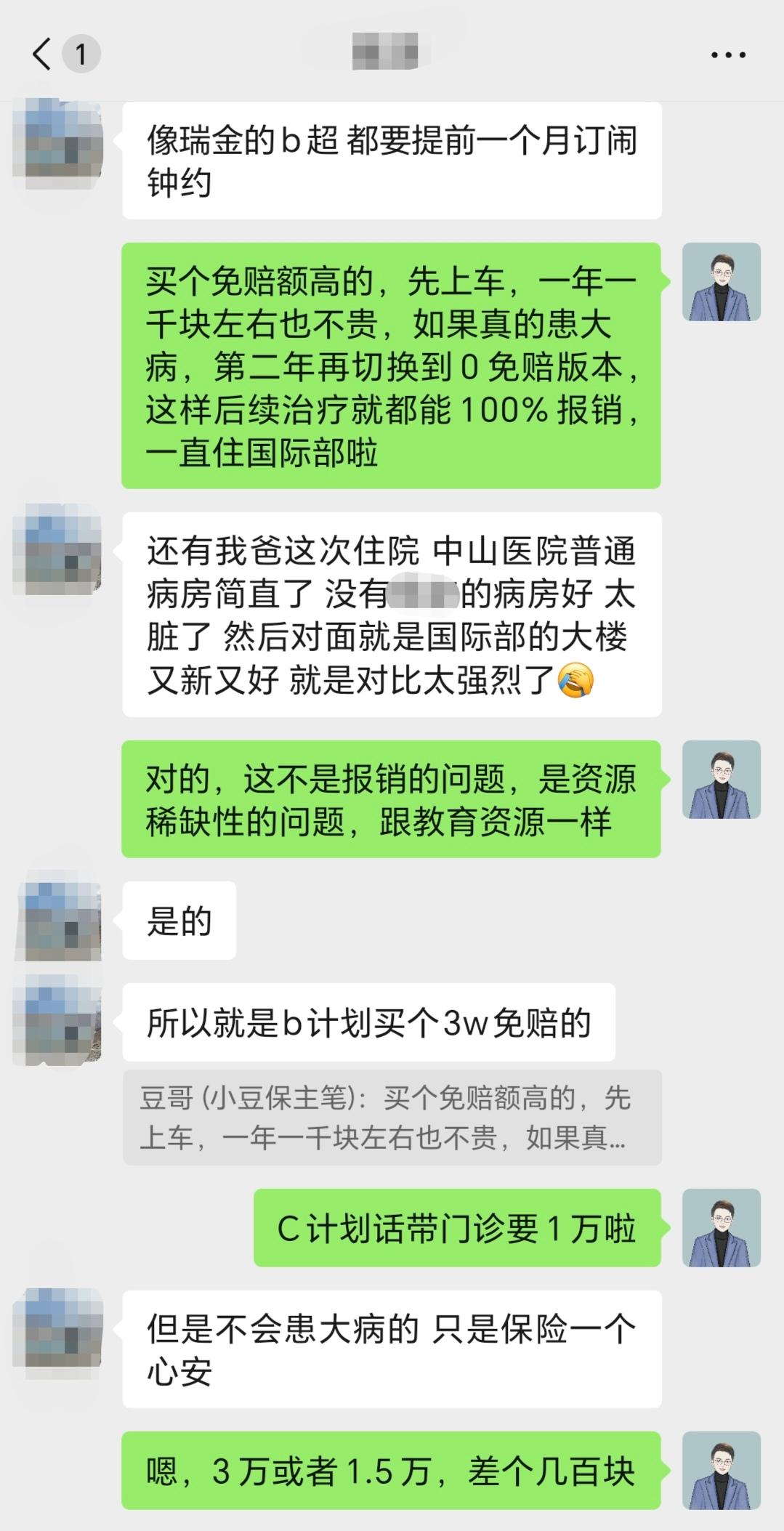 欣享人生2025,计划B你值得拥有~昨天给一位粉丝配置了高端医疗🤗 产品是MSH欣享人生2025(最近刚升级✨) MSH的欣享人生是他们公司入门级高医,一般选这款考虑公立医院特需部🏥。如果要去香港、日本甚至美国,他们家有其它产品(精选、经典)可满足需求🌍✈。 像豆哥所在的武汉,只有一家好点的私立诊所(卓正),99%的人都是去公立医院,大一点的问题都是往同济协和跑🏥。所以如果在二三线城市,可以考虑欣享人生这款。 这位粉丝虽然有钱💰,但她坦言一年都去不了一次门诊,暂时没必要花这个钱💸。她去年照顾家里老人住院,在几个医院都住过,在普通部和特需部强烈的对比下,一边是普通部的人杂,脏乱差,一边是特需部的安静舒适,她愿意花钱买这个就医体验🌟。 有人说看病挂号太难了,买个高医能报特需部,再也不用排队了。这句话看起来没错,但实则并不适合🙅♂。特需部价格贵且要自费,来看病的人自然少。但增加门诊责任,价格上要多增加近1万块💸。假设每次门诊2千元,一年要去5趟才够本,说实话这个杠杆很低。 门诊是一种体验,因为随时都能去看门诊🏥。用户要的是便捷和舒心。其实门诊更多是去私立医院,比如和睦家这种的,离家近服务好🏡。再退一步,就算是买的普通医疗险甚至没有保险。如果要挂专家号,找个黄牛票贩子也能解决问题...(虽然不推荐哦⚠) 确定了只要特需部的住院责任,继续下一步,确定免赔额💰。它逻辑也很简单:门槛越低用到的概率越大,价格自然也就越贵,反之则越便宜,杠杆也越大📈。 几轮沟通下来,粉丝就确定了自己的方向,买高端医疗就是以防万一,解决极端情况的住院🏥。 她选择3万的免赔额,有以下几个考虑: 第一,价格只需1千来块💰,对她来说基本无压力,哪怕到了60岁也才3千多。 第二,3万以内的住院,百万医疗险来报销,所以她又买了一份0免赔百万医疗险🛡。 因为她还担心续保的问题,所以20年保证续保刚好能解决这个问题🎉 百万医疗+高端医疗的搭配,在40岁的年龄,不到2千块💰,完美解决问题🎉 整个沟通1小时搞定,比起动辄要研究半个月的百万医疗险,高效很多 最后总结一下欣享人生2025 计划A: 预算有限又想要高端医疗、没有既往症、对公立特需部国际部有需求的 计划B:想要充足保障的、对公立特需部国际部有需求的、有既往症的 计划C:想要充足保障的、想要普通门急诊责任的、对公立特需部国际部有需求的、有既往症的 欣享人生 高端医疗险