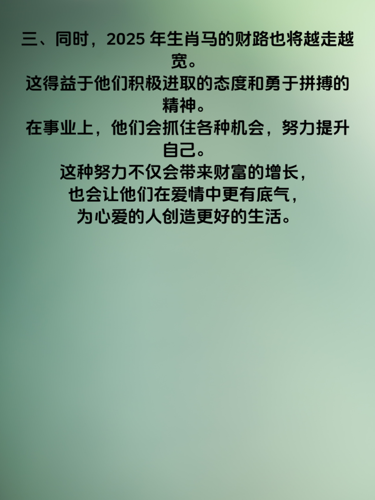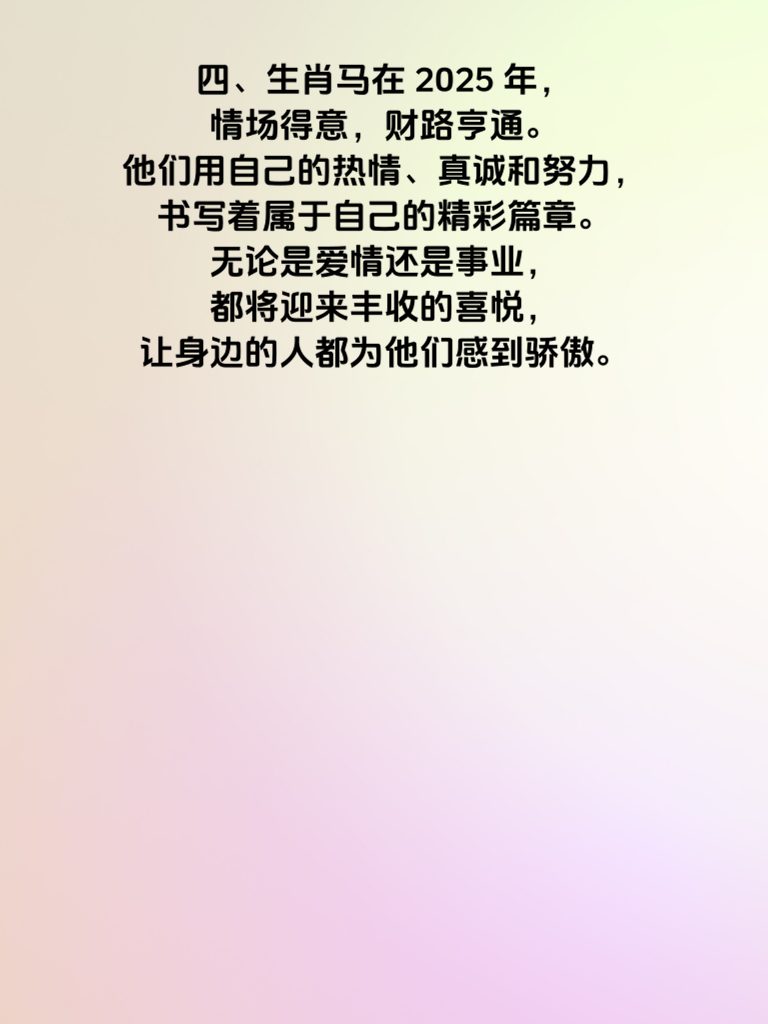 一、生肖马的 2025 年,注定是不平凡的一年。在情场上,他们将展现出独特的魅力,称王并非偶然。生肖马本身热情奔放,充满活力,这种特质在 2025 年更是被无限放大。他们会以积极主动的姿态去追求爱情,勇敢地表达内心的情感。 二、追求女生时,生肖马懂得用真诚去打动对方。他们会用心去了解女生的喜好,精心准备每一次约会。比如,知道女生喜欢看电影,就提前选好浪漫的影片,安排舒适的观影环境。他们的热情和真诚,会让女生感受到满满的爱意。 三、同时,2025 年生肖马的财路也将越走越宽。这得益于他们积极进取的态度和勇于拼搏的精神。在事业上,他们会抓住各种机会,努力提升自己。这种努力不仅会带来财富的增长,也会让他们在爱情中更有底气,为心爱的人创造更好的生活。 四、生肖马在 2025 年,情场得意,财路亨通。他们用自己的热情、真诚和努力,书写着属于自己的精彩篇章。无论是爱情还是事业,都将迎来丰收的喜悦,让身边的人都为他们感到骄傲。