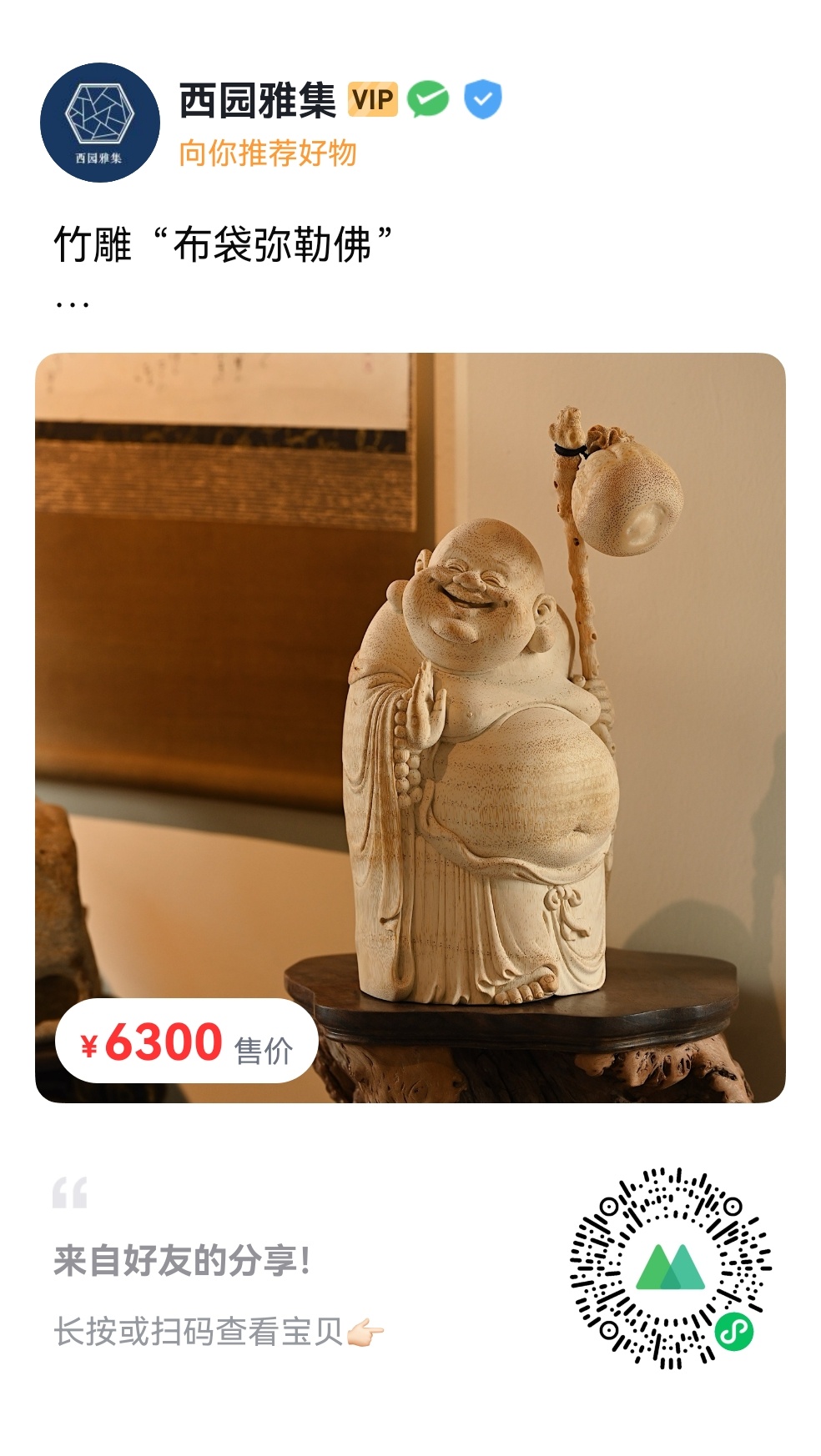 弥勒形神相融,笑意欢喜豁达,大肚能容天下事,左手持杖,杖首挂布袋,既添俏皮灵动,又衬弥勒慈悲随和。