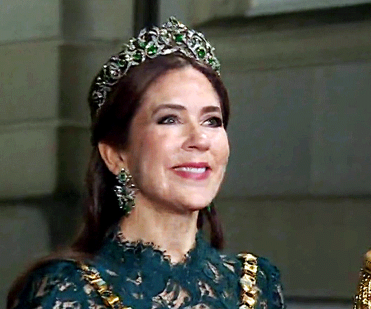 珠宝 分享今年丹麦新年招待会的珠宝特写gif,丹麦家输在国有套装里的祖母绿王冠体量不足,尖顶王冠款不愧是经得住时代考验的blingbling。