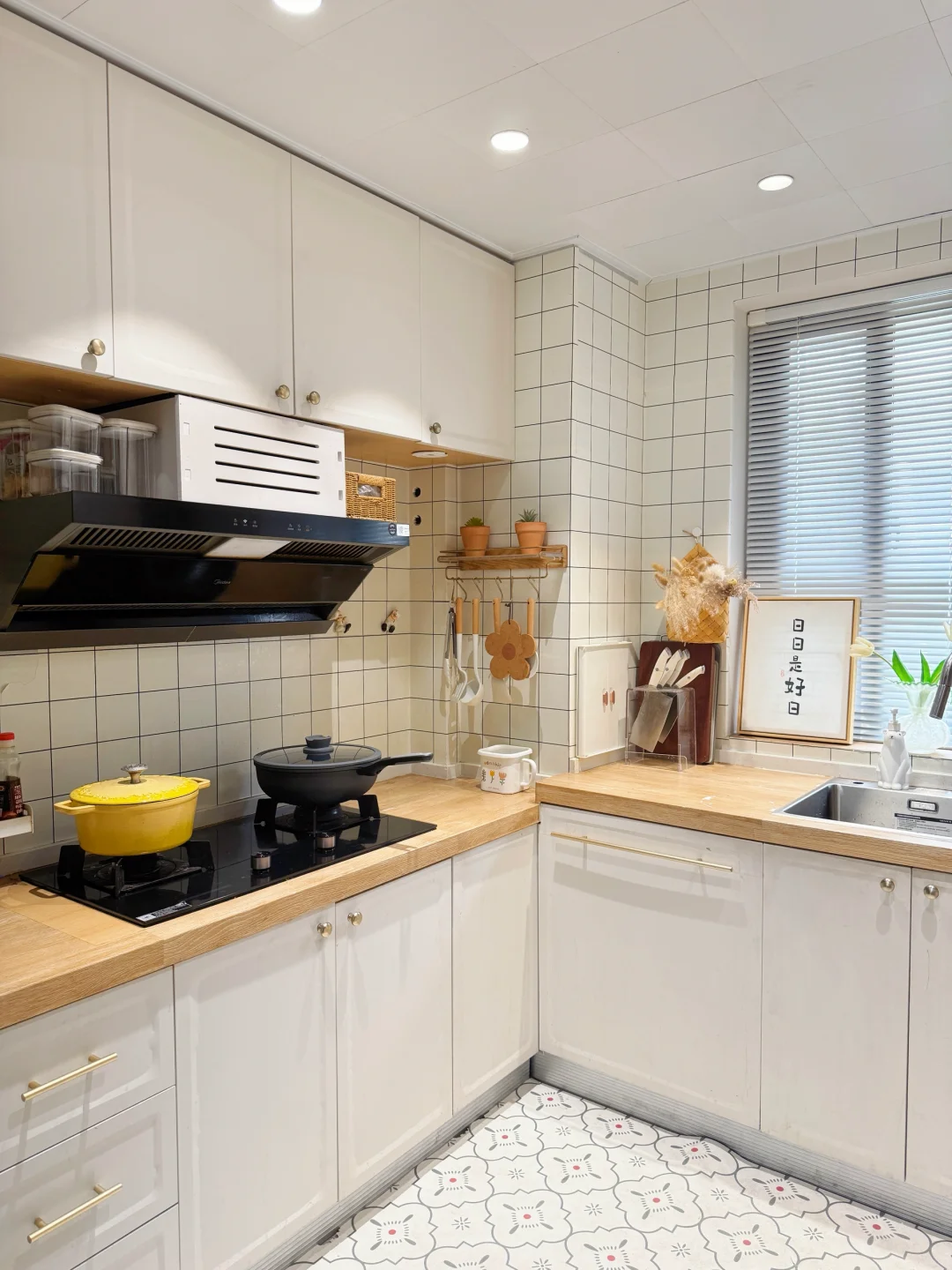 黄橡木色台面、米白色橱柜门、米白格子墙砖都是自己贴纸改造的,地面铺了绿色的PVC小花砖地垫