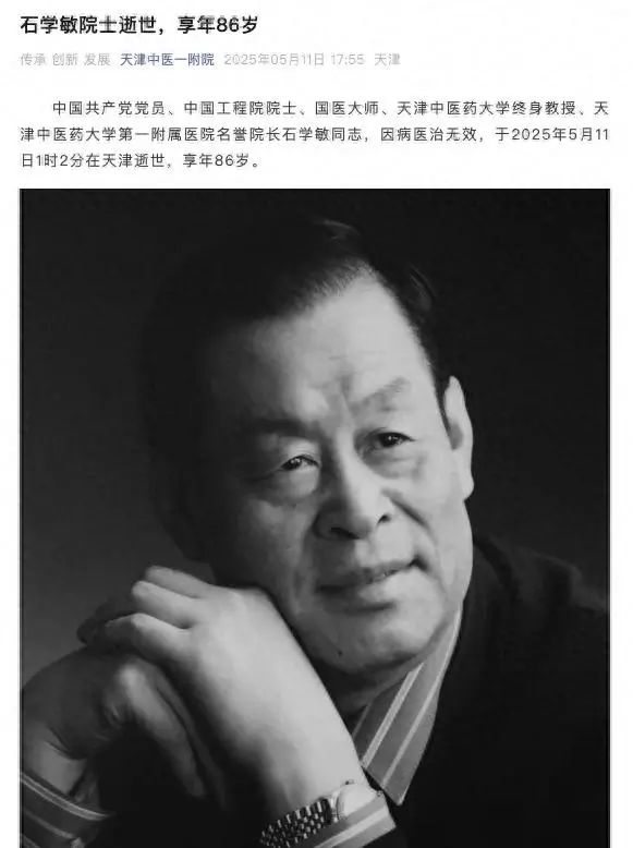 5月11日,天津中医药大学第一附属医院发布讣告,中国共产党党员、中国工程院院士、国医大师、天津中医药大学终身教授、天津中医药大学第一附属医院名誉院长石学敏同志,因病医治无效,于2025年5月11日1时2分在天津逝世,享年86岁。