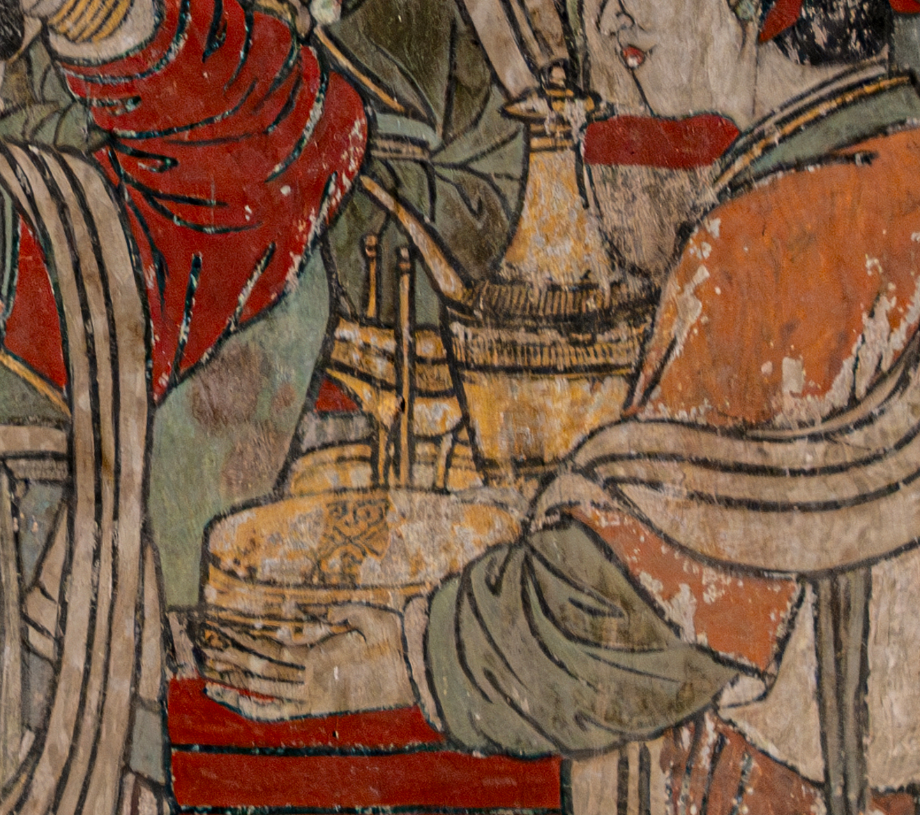 王宫梳妆图实则为水神降雨图右后方的宫苑场景,反映的是苑内侍女正在后面给众神司酒的场景,至于画面中心贵妇或侍女整理头饰,实则超不经意露出袖口内金臂钏,相当于露富。