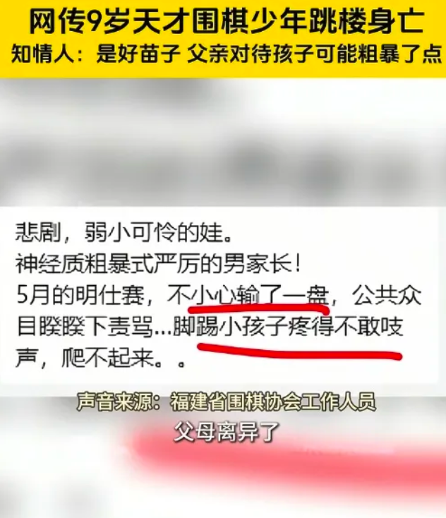 我发现比宋清辉更狠的男人出现了,他就是天才围棋手朱宏鑫的爸爸,只是因为儿子输了一场重要比赛,这个爸爸公然对着孩子一顿辱骂,甚至上脚踢!孩子疼得蜷缩成团却不敢哭出声,当晚就跳楼了。网友:他用最决绝的方式逃离了人间。