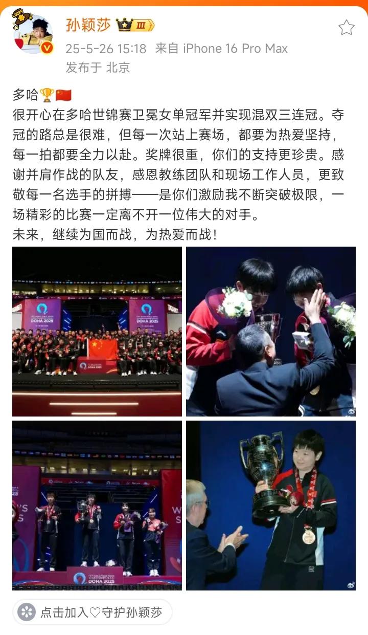 多哈世乒赛征战归来,两冠王孙颖莎发了微博。 这篇博文文笔优美,莎莎各方面都进步了[赞]。 莎莎在博文里真诚感谢了粉丝的支持,感谢了队友,感谢了团队和现场工作人员。 甚至还感谢了每一位选手,她说,“一场精彩的比赛一定离不开一位伟大的对手”。 和王楚钦、蒯曼的博文有点儿差别的是,莎莎的博文下仅有四张图片,一张合影照涵盖了她感谢的所有人,另外两张就是混双和女单颁奖照——巴赫亲切给她颁奖的照片,另一张是女单金银铜选手合照。 莎莎加油,为自己的梦想努力吧[奋斗]!