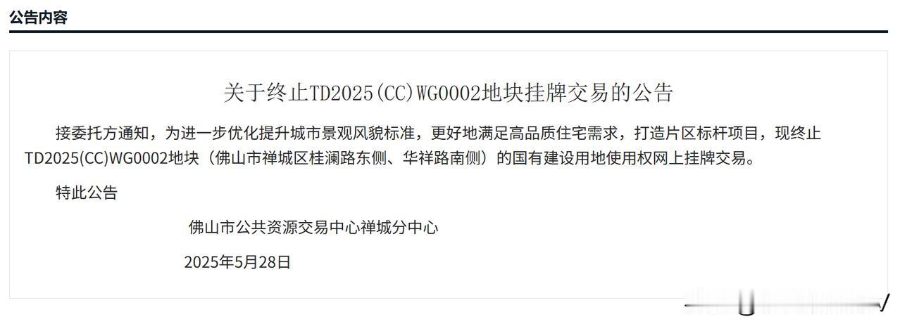 临拍前撤牌! 5月28日,佛山市公共资源交易中心发布公告称,禅城区桂澜路东侧、华祥路南侧地块现终止挂牌出让。 该地块原定于5月30日出让,起拍总价为3.74亿,折合楼面价超9350元/平。 隔壁山姆的建设已如火如荼