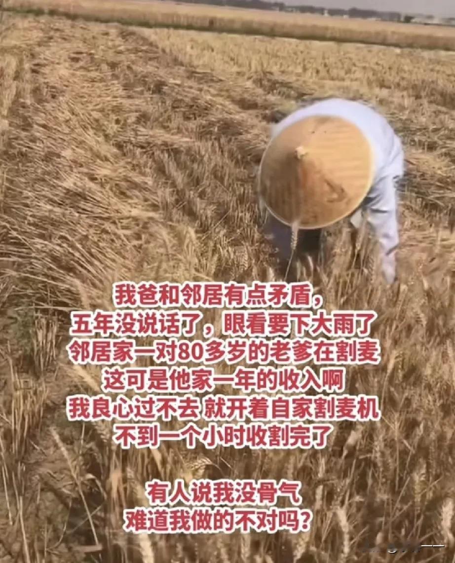 “这位大哥真了不起[赞]!”这位大哥的父母跟邻居有矛盾,5年期间连话都不说一句,两家互不来往。这次邻居5老夫妻在抢收,眼看天就要下雨了,没想到接下来这位大哥的做法让人大吃一惊。 原来这位大哥把自家的麦子收回来后,看着满仓的麦子,大哥很开心,那都是自己和家人的血汗钱以及一年的口粮啊。 可是,当他放眼望去,发现邻居家80多岁的老夫妻还在那佝偻着背弯着腰割麦。他们舍不得钱请收麦机,全靠双手。 大哥看着两个80多岁的老人在那收麦,真是于心不忍。再加上天马上又要下雨了,一旦下雨,那些成熟的麦子可得全部遭殃啊,那些可是他们老两口全年的收入啊。 关键这个老邻居还跟大哥的父母有矛盾,两家5年来没说过一句话。 大哥看着实在不忍心,斗争了半天,也顾不上别人会不会说他没骨气。总之他默默地开着自己的收麦机,不到一个小时,就帮他们收割完了。 大哥的这一做法,引来了网友的热议。 有的网友说:大哥你是好样的!你用温暖的行动化解了两家邻里之间的矛盾,帮助了两个老人!你是个善良的好孩子,好心总会有好报的!祝你一生平安!万事顺心! 有的网友说:大哥是一个善良、有大爱的人,是一个有大格局的人!大哥不念前嫌,帮八十多岁老人收割麦子,不是每个人都能做到的。大哥是个可深交,值得信任的人!小事看人品,这样人会褔德相随! 有的网友说:这大哥好样的!不计前嫌,帮和自家父母有矛盾不说话的邻居收割麦子。肚量大,格局高,心胸宽,是个敞亮人,是个真男人!这样的人应该进村委会。 …… 我想给这位有格局、心胸广、有人情味的大哥点一个大大的赞!真是人间处处烟火气,他将远亲不如近邻诠释得很透彻。 相信80多岁的老邻居为他的善良大气所感动。 老一辈的人仇归仇,恨归恨。大哥不计较父辈矛盾,在紧急关头助人一臂之力,体现果决助人的正义感,更体现了人类刻在骨髓深处的善良。 大家说这个大哥是个妙人吧!在大事面前,这位大哥拿得起,放得下,够爷们。 行得春风,必有夏雨!好人修得人财两旺!祝愿这位善良,纯朴,大气,不计前嫌的大哥好人一生平安!