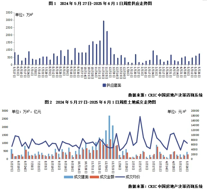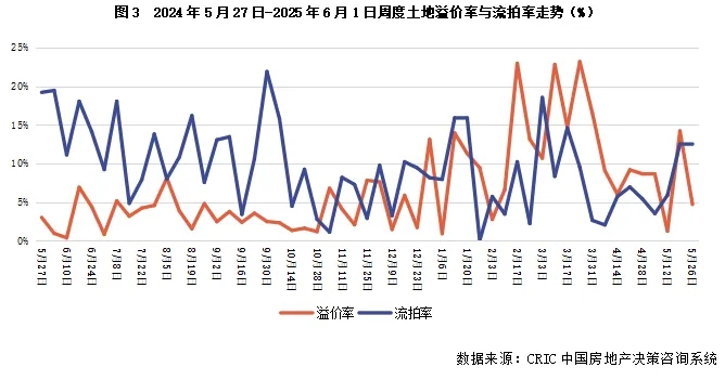 2025年5月26日-2025年6月1日,第22周土地供求规模均环比上升,三四线城市溢价率水平也有所上涨。本周重点城市监测供应建筑面积726万平方米,环比增长25%,成交436万平方米,环比增加64%。本周一二线城市高品质宅地入市频次下降,周度平均溢价率回落至4.7%,但是温州、佛山等三四线城市拍出多宗高溢价地块,三四线平均溢价率达到8.35%,创近5周新高,重新回到年内高位。