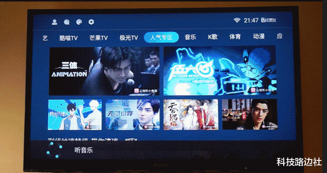 语音遥控器也是非常强大,按住遥控器右上角的语音输入键,然后发出语音指令,比如问天气、听音乐、看电影、看动画片等,甚至是直接打开某个电影,都可以通过语音来实现。