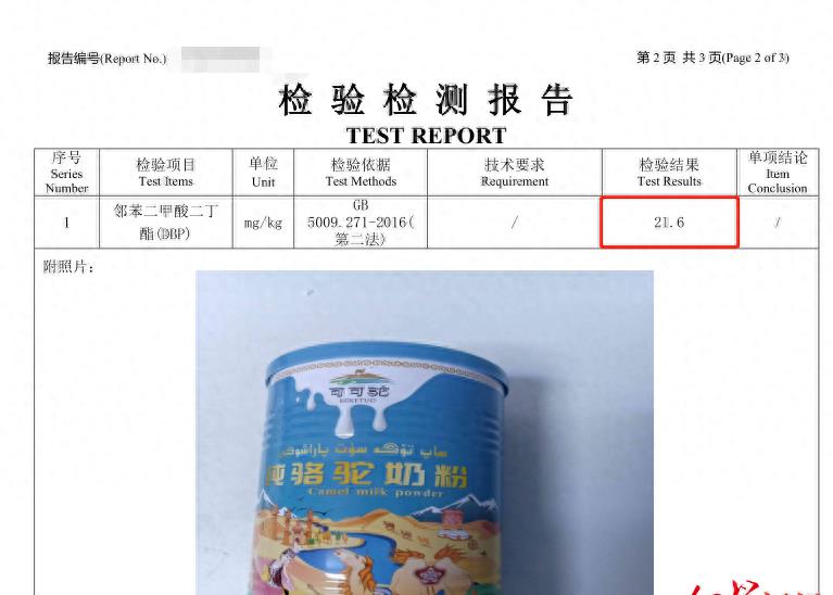 王海助理提供给记者的检测报告显示,该骆驼奶型号规格为320g/罐,第一批次检验日期为6月18日至19日,检测出邻苯二甲酸二丁酯(DBP)含量为21.6mg/kg;第二批次检测日期为7月10日至11日,邻苯二甲酸二丁酯(DBP)含量为0.81mg/kg。王海助理向记者表示,两批次检测出的邻苯二甲酸二丁酯含量远远超出国家标准,邻苯二甲酸二丁酯是一种塑化剂,这种物质在乳制品中不允许添加,检出限为0.3mg/kg。