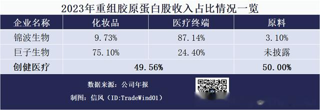 巨子生物主攻护肤品,锦波生物则专注医美产品,创健医疗则原料、终端产品两手抓。