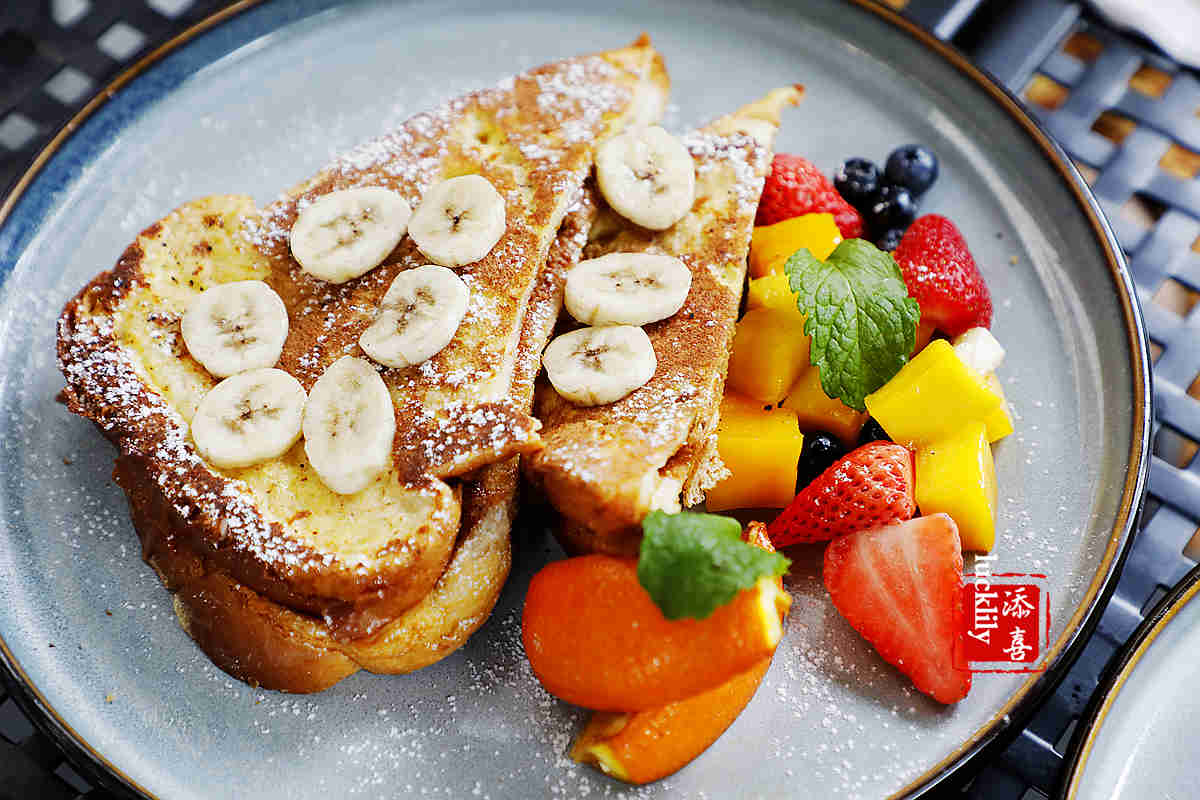 松软奶香吐司裹上玉桂蛋液香煎,夹Lotus Blsoff焦糖饼干酱,玉桂糖粉,搭配香浓糖浆,新鲜时领令水果。
