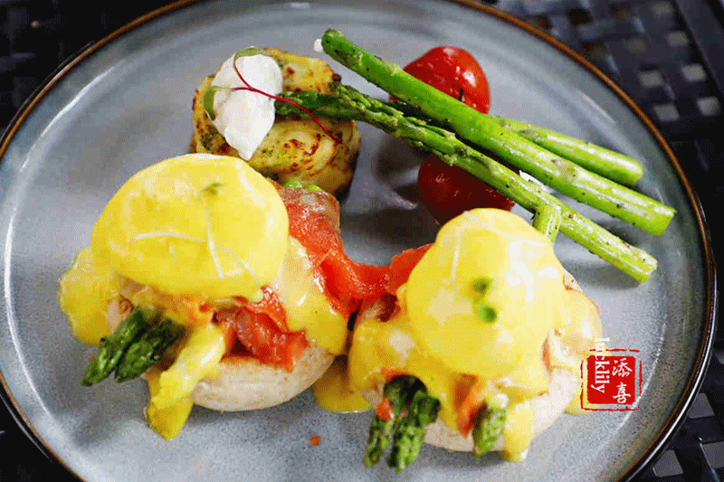 烟熏三文鱼淋上浓郁主厨秘制荷兰汁和班尼迪克蛋及英式全麦麦芬,搭配焗烤西兰花芝士薯饼,烤连株蕃茄、炒芦笋。