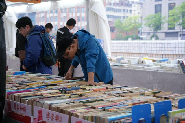 早上9点半,距离市集正式开启还有半小时,就有读者风尘仆仆地赶来,他们中既有不辞辛苦远道而来的老读者,也有在附近工作的上班族。趁着上班前先来市集打打样的张先生告诉记者,去年11月,淘书乐·旧书市集在华东政法大学校园里举办,当时满载而归的他就期盼着新一次的市集开张,“我很喜欢看纸质书,上次就买了二三十本,上周末古籍书店重开,我也买了好多本书。这会儿先来逛一圈,下班后再仔细淘淘。”