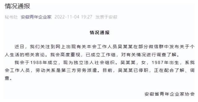 事件在网上引起高度关注后,安徽省青年企业家协会及时发布通报,通报称已成立工作组对此事进行调查,同时表示吴方媛被只是一名工作调度员,目前被停职合作。调查状态。