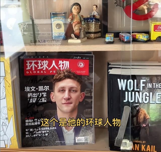最引人注目的是,店内一个显眼的玻璃柜子里,放着一本封面印有埃文照片的环球杂志。