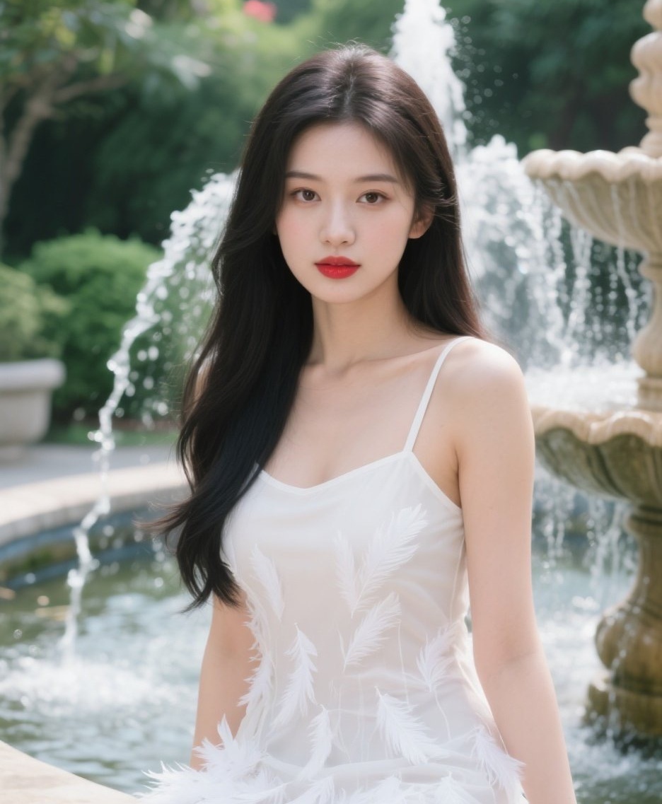 喷水池旁丽人行,水光潋滟衬仙姿