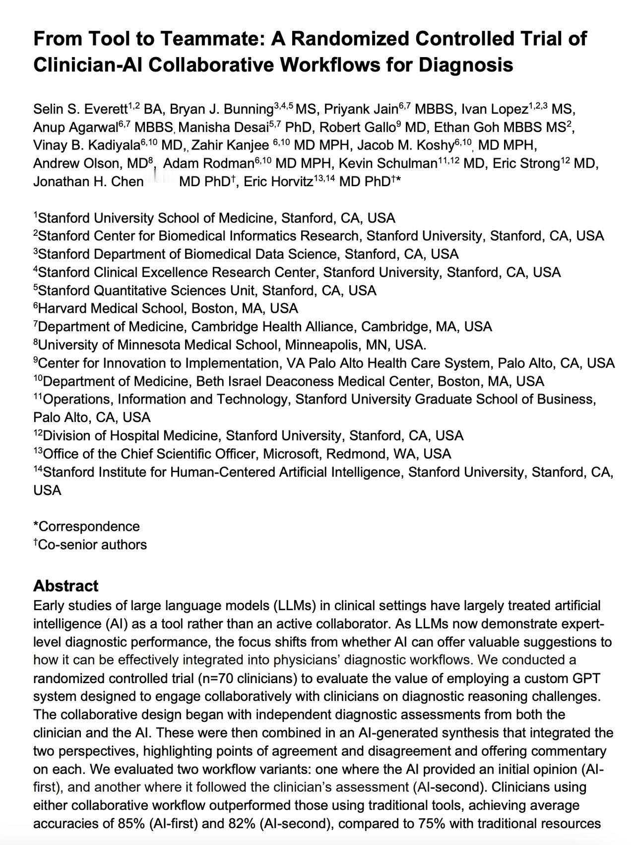 #人机协作让临床诊断更准确##AI与医生协作诊断准确率提高10%# 让AI与医生协作起来,诊断会变得更准确! 斯坦福大学的研究团队公布的最新研究成果,再次肯定了一个结论:有AI作为协作者的医生,准确率要高于仅使用Google/PubMed等传统检索工具的对照组。【图1】 为了让AI不仅仅是提供信息的辅助资源,而是真正参与进诊断过程与医生互动,团队还特地设置了一种定制化的GPT系统。 简单来说,这个系统能获取医生和AI各自独立的诊断意见,然后生成一份综合分析报告。报告中会明确指出双方的共识和分歧点,并对每个观点给出专业的评价。 团队招募了70名美国执照的内科或家庭医学医生,包括住院医师和主治医师,将参与者随机分配到了两个工作流程组之一:【图2】 AI-first组:AI系统首先提供其诊断意见,然后医生再进行自己的诊断评估。 AI-second组:医生首先独立完成自己的诊断评估,然后咨询AI的意见。 对照组的医生仅使用传统资源(如UpToDate、PubMed、Google等)进行诊断,不使用AI系统。 实验结果令人振奋:采用任一协作模式的临床医师,其表现均显著优于使用传统工具的对照组。 协作组平均诊断准确率达到85%(AI-first)和82%(AI-second),而传统资源组仅为75%。 这两种协作模式之间无显著差异,但在实际的临床决策部分,AI-first组的表现略胜一筹。 AI单独诊断的平均准确率高达90%,与两种协作工作流程的表现相当,这说明AI在诊断方面已经具备了很强的能力。 这项研究表明,将AI设计为医生的协作伙伴,可以显著提高诊断的准确性,减少误诊,并提升诊断决策的质量。 值得一提的是,这些结果都还是基于3.5和4测试而得出的结果。试想一下,如果使用了o3或其他模型会是个什么效果……