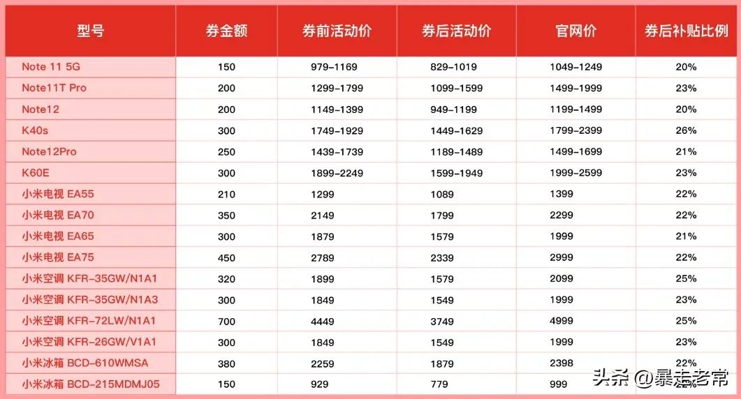 真的香!拼多多百亿补贴“数码家电消费季”再送福利,小米空调最高再降1250元 4月21日晚8点,为了回馈消费者一直以来的支持,拼多多百亿补贴“数码家电消费季”再次对手机、电视、空调、冰箱等数码家电产品发放超额补贴,小米等品牌产品的补贴力度均超过20%,继续击穿全网低价,为消费者提供“天天都是618”的购物体验。 “自消费季活动上线半个月以来,平台数码家电产品的消费持续升温,大部分产品均实现了翻倍增长。” 拼多多百亿补贴“数码家电消费季”的项目负责人表示,在五一消费旺季来临之前,拼多多推出近期最大的补贴力度,旨在全面满足消费者春季家电换新的需求,持续促进消费。 此次活动中,小米旗下的红米Note11T Pro官网价1499元起,券后降至1099元;Note12 Pro 官网价1499元起,券后降至1189元;小米K40s官网价1799元起,券后降至1449元起;小米K60E官网价1999元起,券后降至1599元起,折扣力度均超过20%。 在家电领域,小米电视EA55官网价1399元;券后降至1089元;小米电视EA65也在官网价1999元的基础上,券后降至1579元;小米空调KFR-35GW/N1A1官网价2099元,券后降至1579元;小米空调 KFR-35GW/N1A3官网价1999元,券后降至1549元;小米空调KFR-26GW/V1A1官网价1999元,券后降至1549元;小米冰箱 BCD-215MDMJ05官网价999元,券后降至779元。 4月6日,拼多多百亿补贴正式启动了“数码家电消费季”,首季在百亿补贴的基础上再次投入10亿真金白银,对手机、平板、冰箱、空调等数码家电全品类进行额外补贴。 自活动上线以来,苹果、华为、荣耀、小米、美的、海尔、索尼、TCL、任天堂、戴森、vivo等国内外一线品牌均深入参与,并覆盖了手机、电脑、平板、电视、冰箱、空调、智能手表、VR头盔等数码家电全品类产品。 截至目前,平台手机类目的销量实现环比翻倍增长,尤其是4000元以上的高价位手机环比增幅超过180%。在手机类目的消费区域中,一二线城市的订单增幅最快,很多一线城市的中产、白领以及年轻群体均成为平台数码家电产品的“真香”代言人。 与手机类目相比,家电类目销量增幅更快,全品类销量增长了300%,而各大品牌的空调、冰箱、电视、洗衣机、烘干机等产品也均迎来春季销量的开门红。其中,烘干机销量环比增长280%,洗衣机的销量环比增长超过230%。 受天气转热的影响,空调成为销量增幅最快的产品,销量环比增长超过550%。在销量最高的空调单品中,美的1.5匹一级能效空调销量增长超过1500%,TCL1.5匹一级能效空调销量增长超过1000%以上,格力1.5匹一级能效空调销量增长超过900%。 五一假期临近,户外便携式小家电也成为广大消费者青睐的热销产品,平台车载小冰箱、便携式燃气灶、户外露营灯、小电锅、烧水壶、煮蛋器、多功能锅、咖啡机、挂脖式小风扇等产品均实现环比翻倍增长。 “这次活动均为官方直补,旨在为消费者提供全网最具性价比的产品,无惧比价。” 拼多多百亿补贴“数码家电消费季”的项目负责人表示,参与此次活动的也多为品牌旗舰店,官方正品保障,提供正品发票。活动长期在线,消费者随时都可以一站购齐所需产品。 在继续击穿全网低价的同时,拼多多百亿补贴还对物流、售后等服务体系进行了专项升级,为消费者提供买贵必赔、全国联保、假一赔十、送货上门、上门安装等全方位的服务保障,确保消费者“安心买、放心退”。