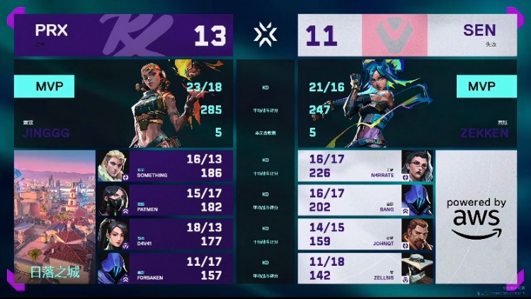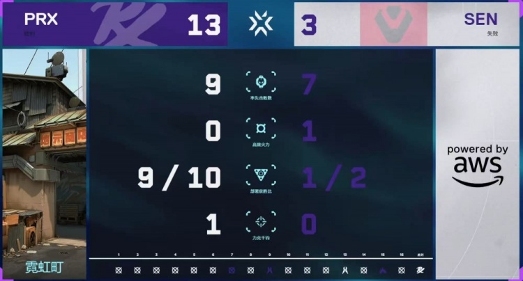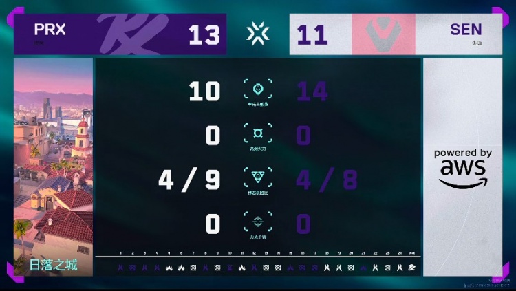 PRX开局拿下手枪局后打出一波6连胜,随后SEN在第七回合拿下一分后被PRX在追分,SEN随后强行拿下一分但是被PRX完全读透,PRX在打出一波3连胜成功帮助队伍上半场10-2SEN,下半场PRX拿下手枪局后再拿下奖励局,SEN在长枪局拿下一分后被PRX直接翻盘拿下胜利!