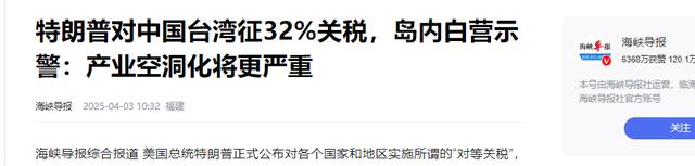特朗普对中国台湾征32%关税,岛内白营示警:产业空洞化将更严重——海峡导报2025-04-03