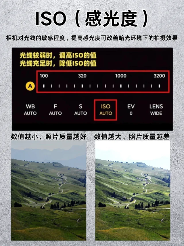 1⃣ISO:感光度(根据环境调节数值控制明暗)