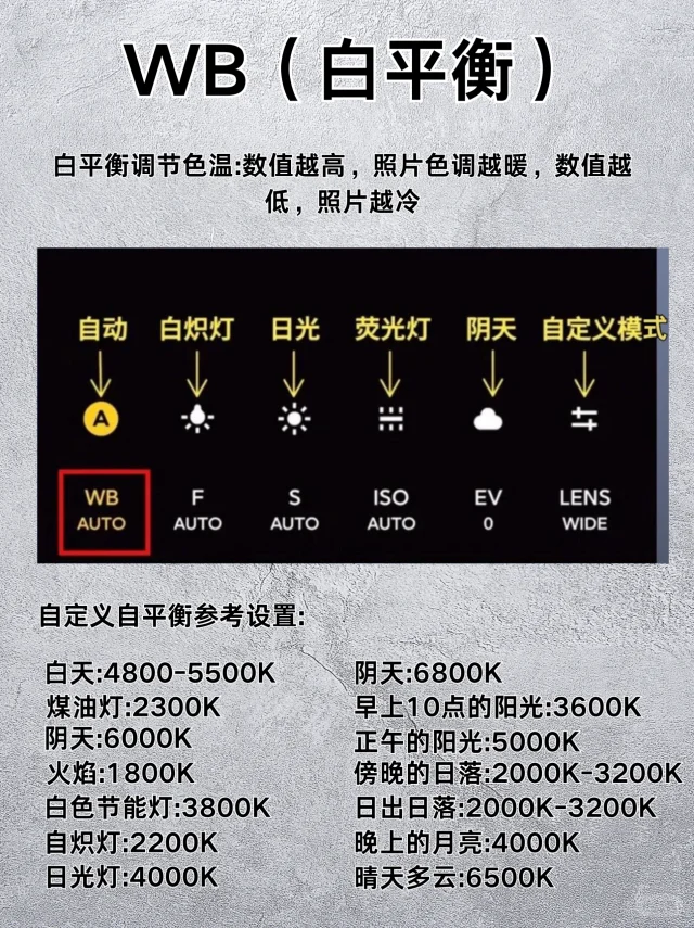 5⃣WB:白平衡(色温,数值越大画面越暖,反之一样)