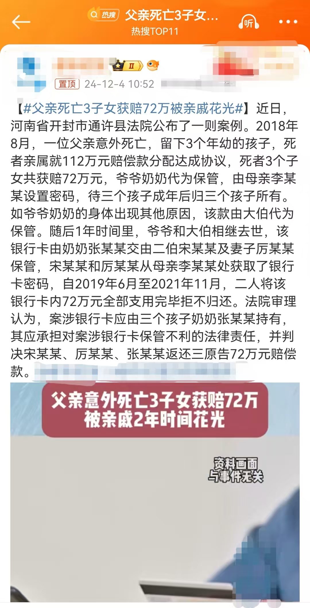近日,一则令人气愤的新闻引起了广泛关注。在河南省开封市通许县,发生了一起亲戚罔顾亲情、侵占赔偿款的事件。2018年8月,一位父亲意外死亡,留下了3个年幼的孩子。经过协商,死者亲属就112万元赔偿款达成分配协议,其中3个孩子共获得72万元。考虑到孩子年幼,这笔钱由爷爷奶奶代为保管,并由母亲李某设置密码,待孩子们成年后再归还给他们。然而,命运似乎对这个家庭格外残酷,随后的1年里,爷爷和大伯相继离世,银行卡便由奶奶张某转交给二伯宋某及其妻子厉某保管。