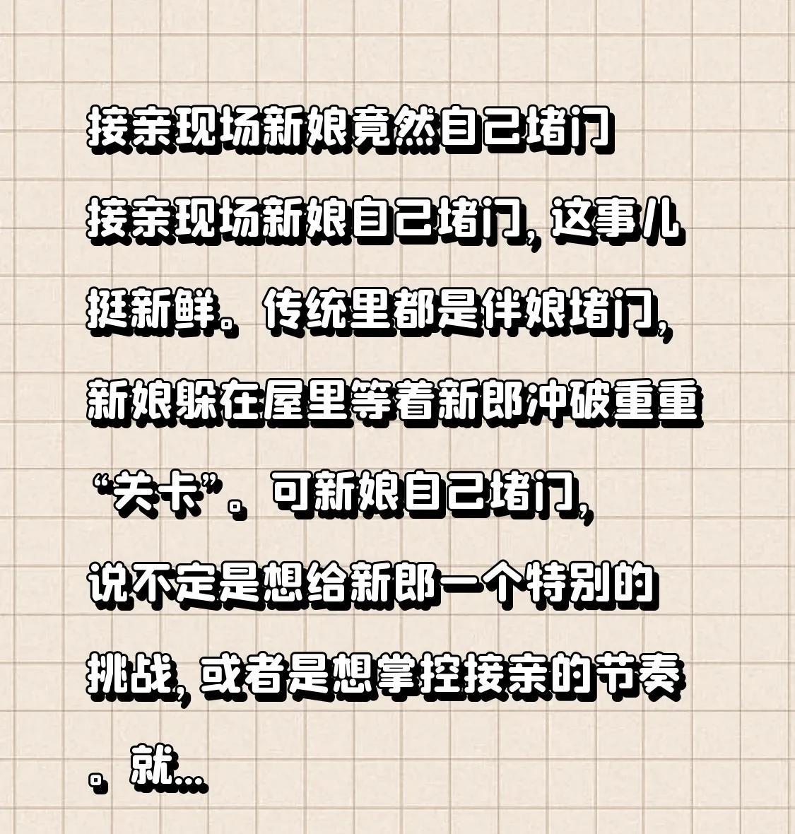 接亲现场新娘竟然自己堵门 接亲现场,新娘居然亲自堵门,这可真是件新鲜事儿。 在传统的接亲环节里,向来都是伴娘负责堵门的,新娘呢,就安安静静地躲在屋里,等着新郎冲破一道道的“关卡”。然而这位新娘却自己堵门,这或许是想给新郎一份别样的挑战,又或者是想要把控接亲的节奏。就好比山东的那场接亲,新娘把堵门变成了惊喜。不过呢,也正如网友所言,这可能会给人一种不想嫁的感觉。说不定新娘是个特别有主见的人,不愿遵循那老套的接亲模式,一心想要创造独属于自己的特别记忆。 不管怎么说,这都表明了如今的年轻人对接亲仪式有了新的想法。#奇葩接亲# #婚礼接亲流程# #新娘入场瞬间# #堵门伴娘#